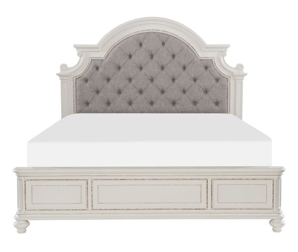 Bedroom set contains: upholstered panel queen bed, dresser with mirror, and one nightstand. See store for details.