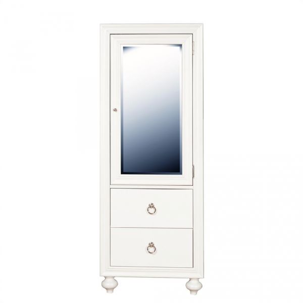 Add contemporary glam to your child's bedroom with the Bella Wardrobe. The large mirrored door conceals 2 adjustable shelves. Metal drop ring hardware adorns the bottom drawers, while the top drawer is felt-lined. Turned bun feet add to the charm of this delectable piece. Presented in a glam white finish.