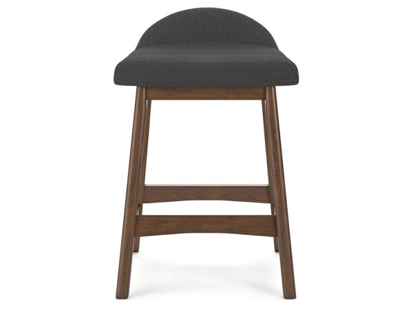 This upholstered bar stool adds an air of playful simplicity to your dining space, capturing the architectural language of mid-century stylings. The seat invites the eye with a soft-edged silhouette and charcoal-hued cushion. A casual, yet timeless, finish on the frame creates visual contrast to complete this study in form and function.
