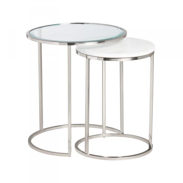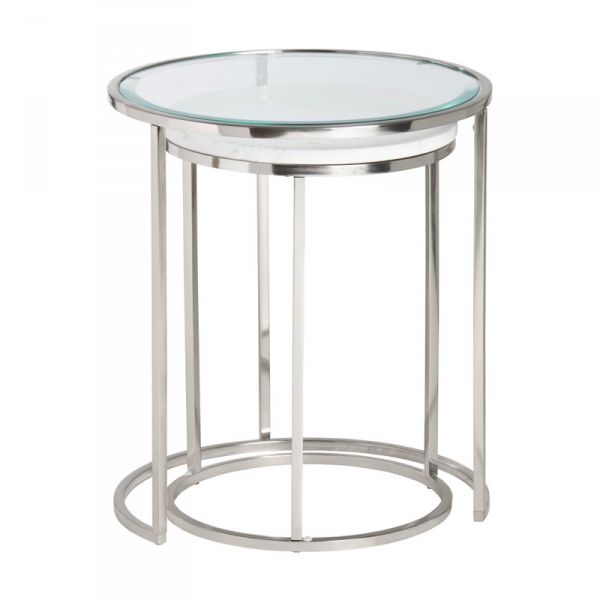 The Cellini Nesting End Tables is a dynamic duo where contemporary elegance meets playful functionality! They are designed to bring a touch of glamour and versatility to your living space. Their contemporary flair is matched only by the round, tempered glass and natural white marble top, creating a stunning contrast of style.