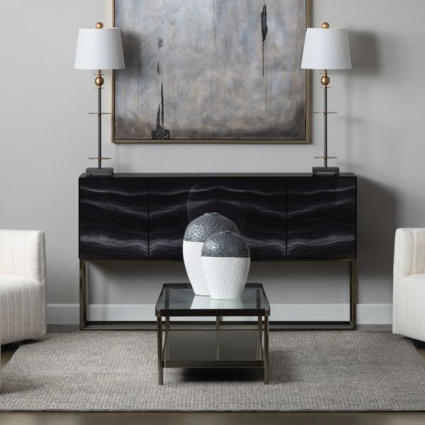 The Ellison Cocktail Table is a contemporary piece that features a glass top as well as a glass shelf right underneath.