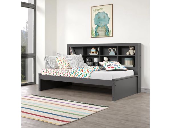 This gray day bed is charming addition to your child's room that blends functionality with style. Crafted with love by a family-owned legacy, this daybed not only offers a cozy spot for your little one to rest but also brings organization and elegance to their space. The built-in bookshelves inspire a love for reading and keep cherished stories close at hand. It's the perfect blend of comfort and convenience, designed to maximize space and encourage tidiness. Let this daybed be the setting for countless bedtime stories, cozy moments, and cherished memories.