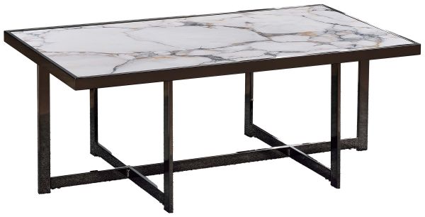Sleek sophistication centres a room with the Kayley cocktail table. This contemporary masterpiece boasts a stunning sintered stone inlay atop a robust black nickel-finished iron base, blending elegance with resilience. Supported by a sled base with cross stretchers, it not only exudes style but also ensures unwavering stability.