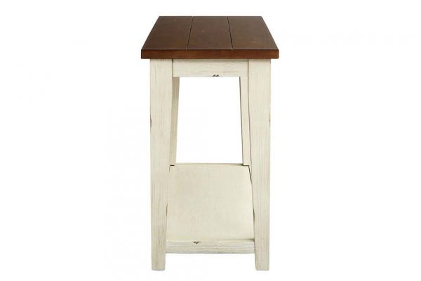 The Lancaster transitional sofa table features a lightly distressed White base finish, simple stick built design elements, transitional tapered legs, and a convenient lower storage shelf.