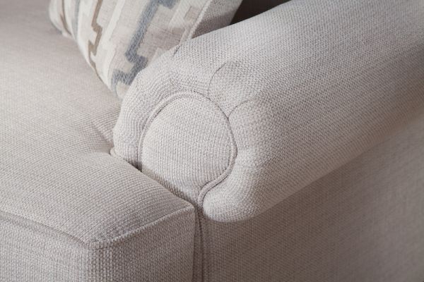 The Mallory sofa combines classic charm with modern comfort. Upholstered in a soft beige fabric, this sofa features elegant rolled arms and plush cushions for a cozy seating experience. The sturdy construction ensures durability, making it a stylish and practical addition to any living room.
