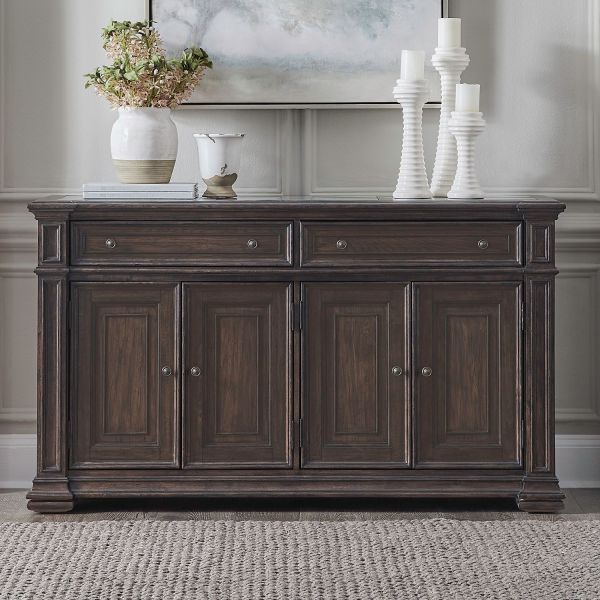 The Provence Park buffet is a stunning fusion of functionality and artistry that elevates your dining space into a realm of timeless elegance. The square turned pilasters, adorned with graduated bead molding, stand tall and proud, creating a sense of regality and adding depth to the buffet's overall design. The drawers and doors are framed with bead molding accents, showcasing a level of detail that sets this piece apart.