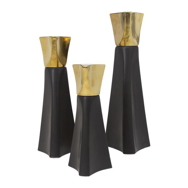 This set of three bottles features tall, tapered bottle forms in a warm matte brown finish, each topped with a removable gold lid that adds polish and contrast.