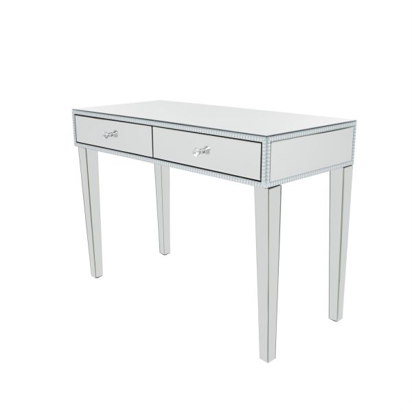 This glam style drawer desk features wide rectangular top and drawers, clear crystal details, and elongated legs. The wood material of this desk is securely attached with reflective mirror panels for a unique and eye catching centerpiece.
