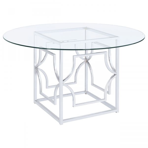This round dining table creates a refined focal point with its clear tempered glass top and artful geometric base. The sculptural metal frame features intersecting curves and angles, electroplated in a high-shine finish for a bold, contemporary effect. Its open design keeps the space light, while the tempered glass adds a durable, easy-care surface for everyday use or entertaining. Create a stunning visual with the bold colors from each armless dining chair. Open up a dining room with sleek and metallic chrome legs. The blue cushioned back and seat is filled with button tufting for an elegant look.Table Dimensions: 54L x 54W x 30.25HChair Dimensions: 25.25L x 19W x 36.5H