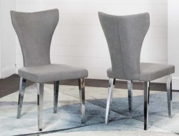 Bring standout style to the dining room with the Asher Chrome and Upholstered Sidechair. Brilliantly reflective legs create a foundation for a supple seat upholstered in an grey fabric. Pairs lovely with glass, acrylic and other chrome pieces.