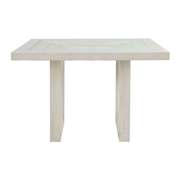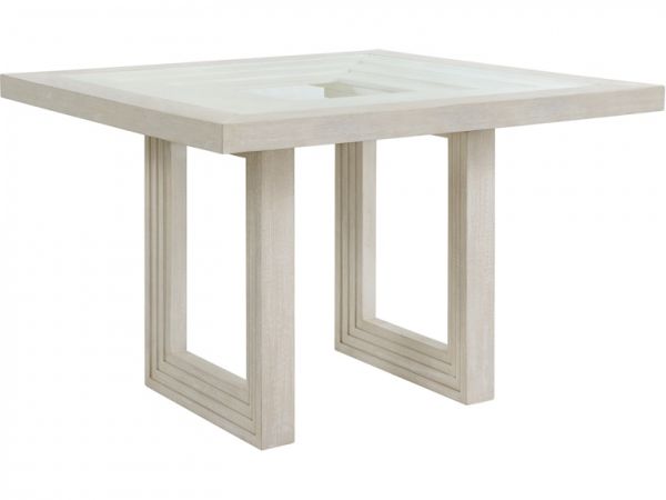 Introducing the Rhiannon Counter Table, a striking blend of modern aesthetics and functionality. Featuring an 8MM glass insert and adorned with raised geometric patterns, it showcases contemporary elegance. The antique white finish enhances its timeless appeal, while the double U-shaped base provides stability and a stylish silhouette.