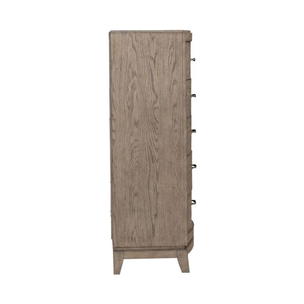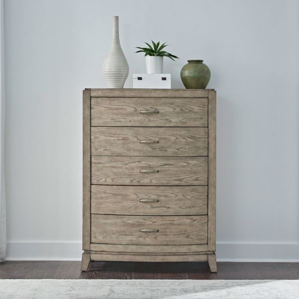 Create a calm and peaceful oasis with the Avalon 5 drawer chest. The journey into the Avalon 5 drawer chest begins with its unique bow shaping; a graceful curve that lends a touch of artistry to its silhouette. This subtle design element, combined with step top molding, creates a visual masterpiece that seamlessly blends traditional charm with contemporary flair. The Avalon chest isn’t just a utilitarian piece; it is a work of craftsmanship that transcends the ordinary. The floating style base, supported by angled tapered feet, adds a sense of lightness and modernity to the dresser.