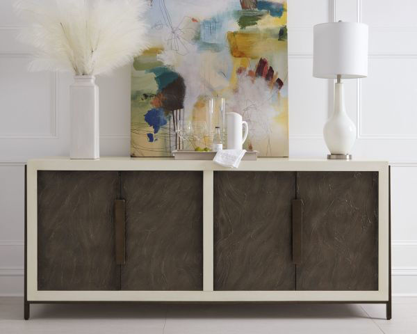 High contrast commands attention, and this striking credenza brings the drama by combining an alabaster finish with deep bronze tones for a look that’s as elegant as evening wear. A modern metal frame in a rich burnished bronze finish accentuates the simple angular lines of this piece, drawing attention to the four uniquely textured door fronts and large vertical hardware. The left facing side features one drawer and one adjustable shelf, while the right facing side contains one felt-lined drawer and two adjustable shelves.