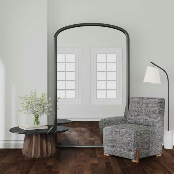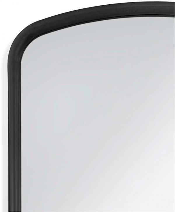 The Brookings Floor Mirror features an arched top with a squared base inspired by Louis Philippe styling. The frame is constructed with a resin frame and a black finish.