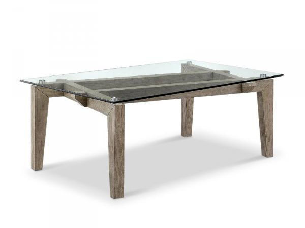 Simple design never goes out of style. The Exeter Rectangle Cocktail Table is easy to work into most rooms, with a sparkling clear tempered glass top and neutral tone weathered wood base. An off center crosshatch frame keeps things interesting.