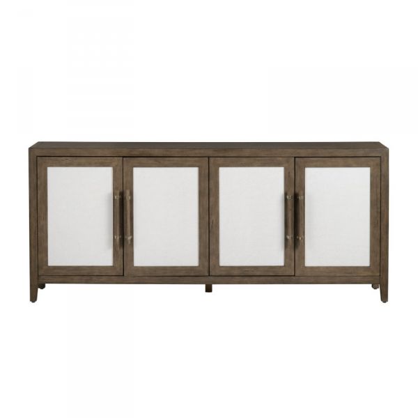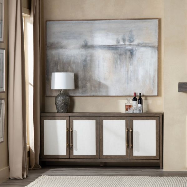 Refresh your living room or dining room with the Finn sideboard. This piece has wooden handles reinforced with metal hardware, two shelves with different heights, and wood doors tastfully contrasted with canvas panels.