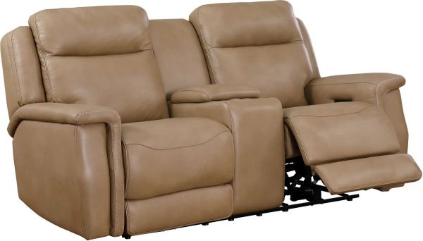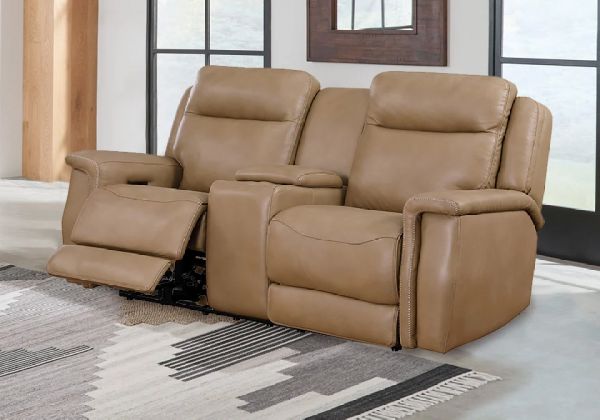The Fischer power reclining loveseat is unmatched in quality and function. Wrapped in top-of-the-line leather and contrast stitching, bring the magic of the movie theaters right to your home to share with a partner. Built into the loveseat is a headrest and footrest that smoothly moves back and forth thanks to the glider mechanism. Each member of the Fischer family also includes a USB charging port as well as a "home button" that will reset the piece back to its natural state.