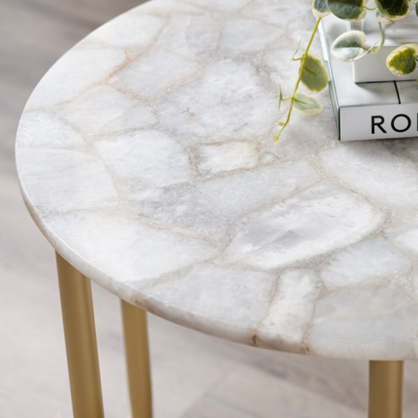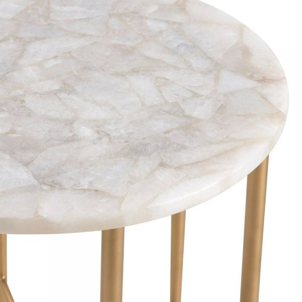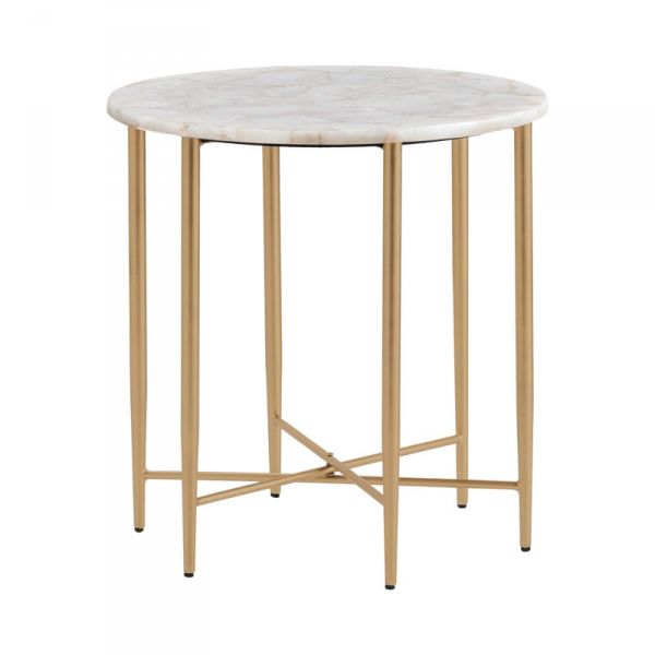This round, transitional accent table has six legs connected by an asterisk design in the middle. The gold finish of the metal legs complement the white marble table top that will beautifully support your favorite lamp or plant.