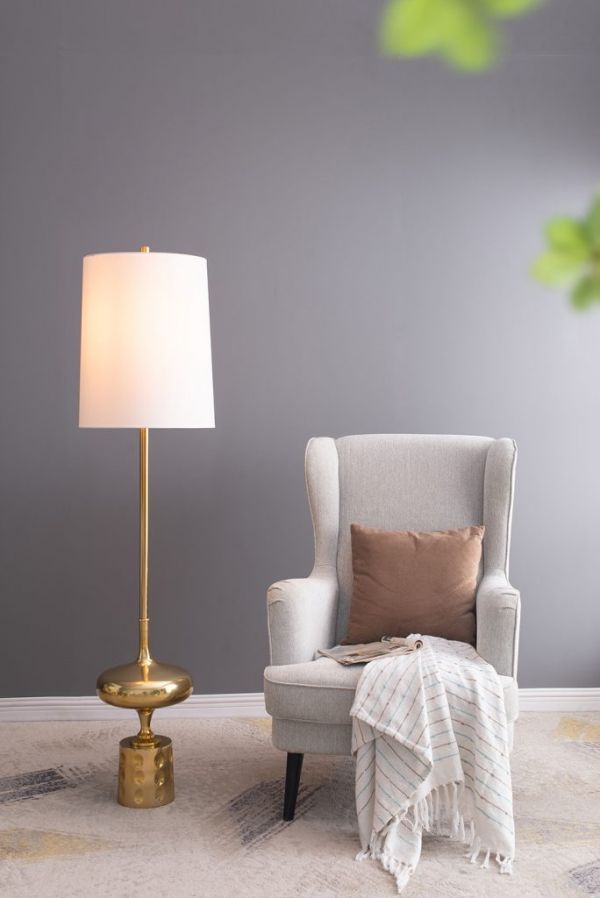 Crafted from durable, sturdy aluminum, this contemporary floor lamp features a white fabric shade, a round pedestal base, and an elongated body that is accented by a disc towards the foot. This piece will slot perfectly into the corner of your living room, dining room, or bedroom, with the white shade pairing with a bulb to illuminate your space with a warm ambiance.