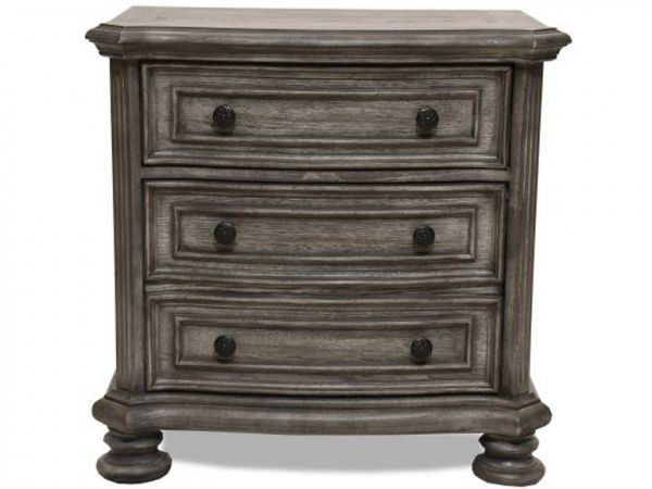 The grand scale and style of the Lakeway Nightstand provides stunning appeal while accommodating your bedside storage needs. Top drawer is felt-lined. An outstanding gray pecan finish enhances the wood grain character of this exceptional piece. Includes USB ports.
