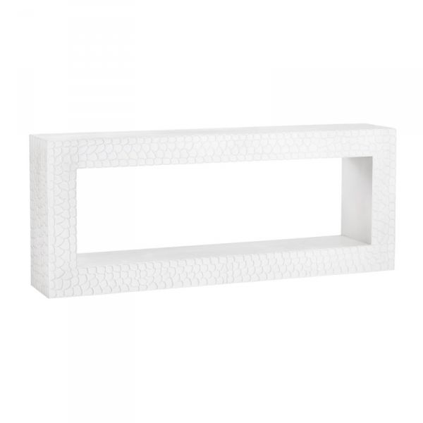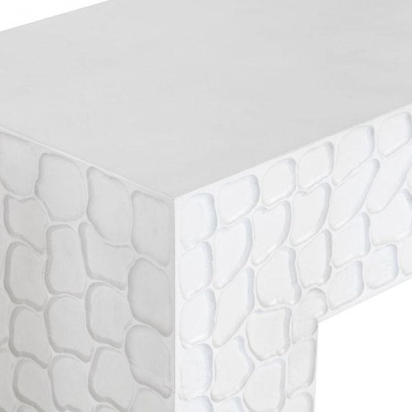 A white console table with rocky grooves and a simple, angular
