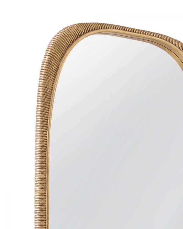 The Malton Floor Mirror features rounded corners and a textured frame surface. The mirror is constructed with a resin frame and finished in gold.