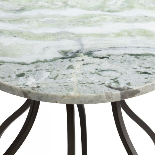 Thoughtfully designed with precision, the frame of this playfully geometric table is crafted from open-metal in a sleek, matte black finish. Topping the piece is a slab of natural marble that showcases a striking display of gray, ivory, green and silver hues that elevate the design for a mesmerizing use of mixed materials and contemporary aesthetics.