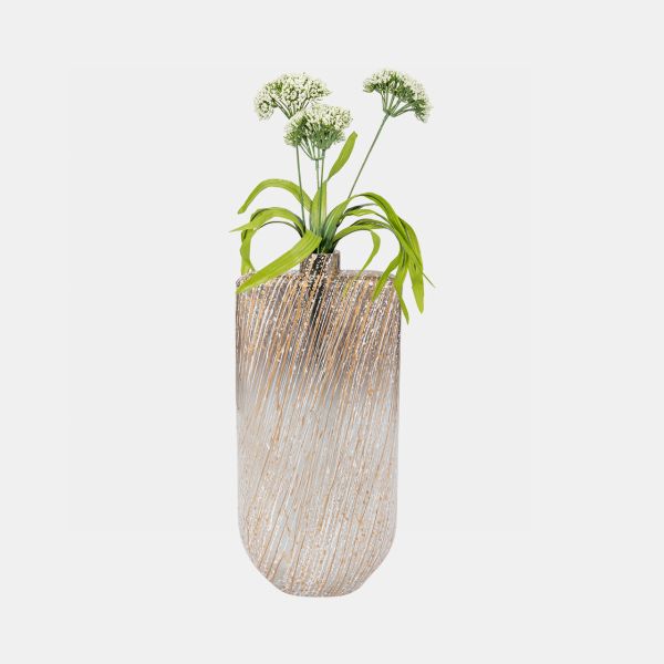 This vase is covered in multi-colored stripes that create a fun look and suit a contemporary aesthetic.