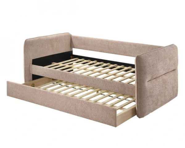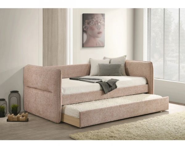 The Philipa twin daybed combines modern versatility with simple elegance to work as a lounge piece or guest bed. Upholstered all around in mauve fabric, it features clean-lined arms and back that offer both comfort and a tucked-in profile. The integrated pull-out trundle provides practical extra sleeping space without disrupting its sleek silhouette. Soft cushioning and a slatted bed frame removes the need for a box spring.