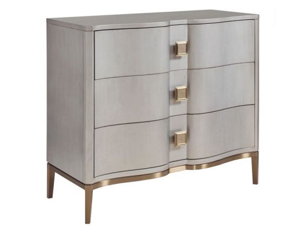 The Randolph dresser features three drawer with the bottom drawer lined with Cedar. The base is stainless steel in a Satin Gold finish with adjustable levelers. There are hand holds in the back of the case for easy mobility.