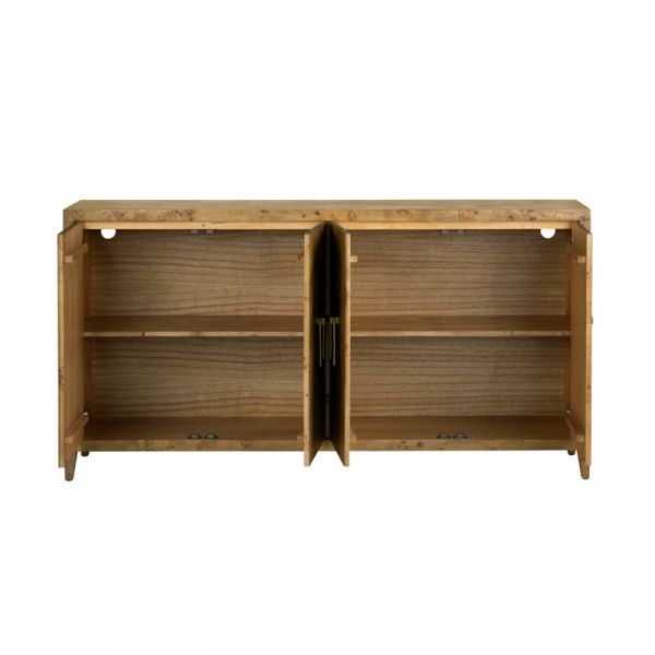 Elevate your decor with the Richmond sideboard. The warm golden brown Mappa Burl wood body, with its distinctive yellow undertones, exudes elegance. Four doors, featuring the same Mappa Burl with gold oversized square drop hardware and upgraded European hinges, add a touch of luxury. Inside, two shelves offer ample storage, while two cord management holes keep cables tidy.