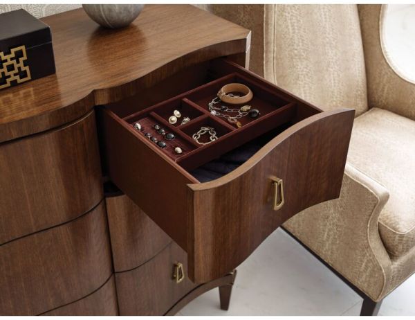 The Richmond dresser features nine drawers. The bottom three drawers are Cedar lined. A brown jewelry tray is provided in the top right drawer. It comes with adjustable levelers and hand holds in the back of the case.