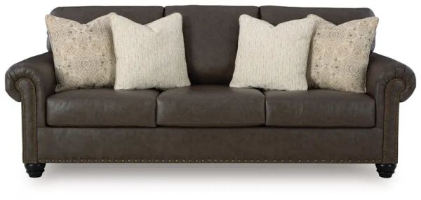 Add a touch of Southern hospitality to your living space with the Roxmere Umber Sofa. This piece combines that warm, welcoming charm with style and affordability. It features stunning umber fabric upholstery, tailored to perfection with elegant rolled arms and delicate nailhead trim, adding a hint of timeless elegance.