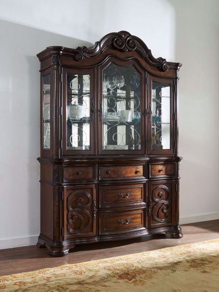 The Royale Buffet with Hutch evokes memories of the detail and craftsmanship of yesterday's antiques, updated for today. A warm, brown pecan-colored finish over oak and ash burl veneers combines with shaped fronts and tops to create a truly grand presentation. Etched glass and carved scrollwork complete the presentation. Touch activated lighting.