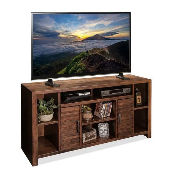 Straight forward design and a fine whiskey finish on knotty alder come together to create the Sausalito TV Console. Set off with flat black hardware, the natural beauty of the wood comes alive. This uniquely designed and hand crafted in the USA entertainment center holds up to a 73" TV. Features include 8 storage areas, 2 cabinets with slatted doors, and cutouts for cable management.
