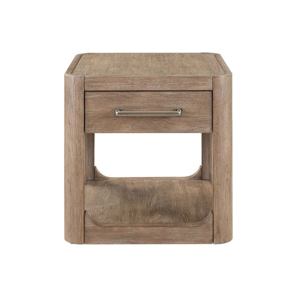 Create an unforgettable setting of casual elegance with the South Bend end table. The highlight of this end table is its storage drawer, featuring a flat-cut drawer front for a sleek and contemporary aesthetic. Accentuated with Satin Pewter bar pull hardware, the drawer adds a touch of understated elegance while providing convenient storage space for small essentials. The rounded wide legs flow seamlessly into a shaped bottom rail, creating a cohesive and harmonious design.
