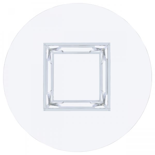 This round dining table creates a refined focal point with its clear tempered glass top and artful geometric base. The sculptural metal frame features intersecting curves and angles, electroplated in a high-shine finish for a bold, contemporary effect. Its open design keeps the space light, while the tempered glass adds a durable, easy-care surface for everyday use or entertaining. Create a stunning visual with the bold colors from each armless dining chair. Open up a dining room with sleek and metallic chrome legs. The blue cushioned back and seat is filled with button tufting for an elegant look.Table Dimensions: 54L x 54W x 30.25HChair Dimensions: 25.25L x 19W x 36.5H