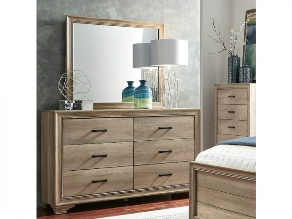 Crafted of melamine and rubberwood solids, this kit features a sandstone finish, picture frame cases, double bead molding, bracket feet, paper drawer interiors, and is accented with antique brass bar pull hardware. The Sun Valley bedroom set creates the perfect balance for condos, lofts or second bedrooms. This bedroom set contains: