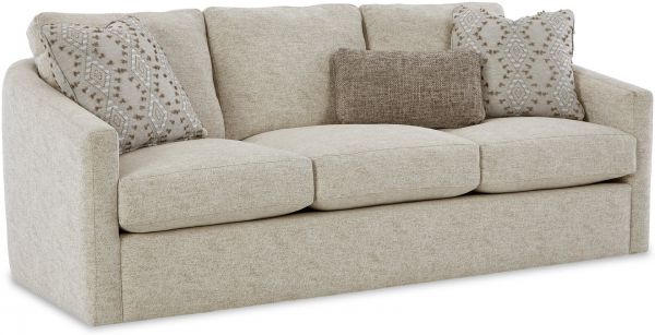 Make a statement with this chic and curvy style from the Teddy transitional sofa. It features a high sloping track arm that wraps into a beautiful curve around the back, catching your eye from every angle. French seamed all over to give a clean and modern aesthetic, this piece has loose box border back pillows and plush Blend Down seat cushioning.
