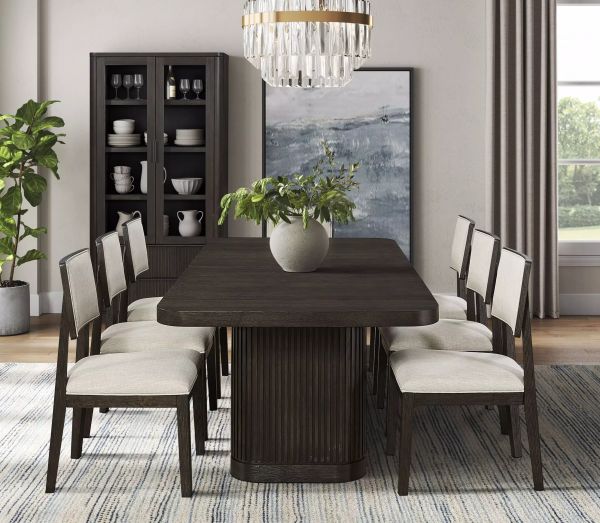 Elevate your dining space with the Tulane ding set, meticulously crafted to exude sophistication and warmth. The standout feature of the collection is its unique slat fluted tambour detailing, an element that adds depth and texture, creating an inviting atmosphere for family gatherings and entertaining friends. Each piece in the collection showcases this exquisite craftsmanship, making a bold statement in any dining setting.The seats are upholstered for extra comfort and the table can be extended to serve extra guests.
