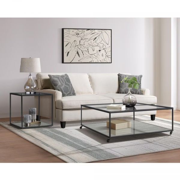 The Yasmin cocktail table offers a stylish and contemporary addition to any living space. With a sleek tempered glass top and a convenient bottom shelf, this table provides ample surface area for displaying decor or keeping your essentials within easy reach. The sturdy metal legs not only ensure stability but also lend an industrial charm to the design.